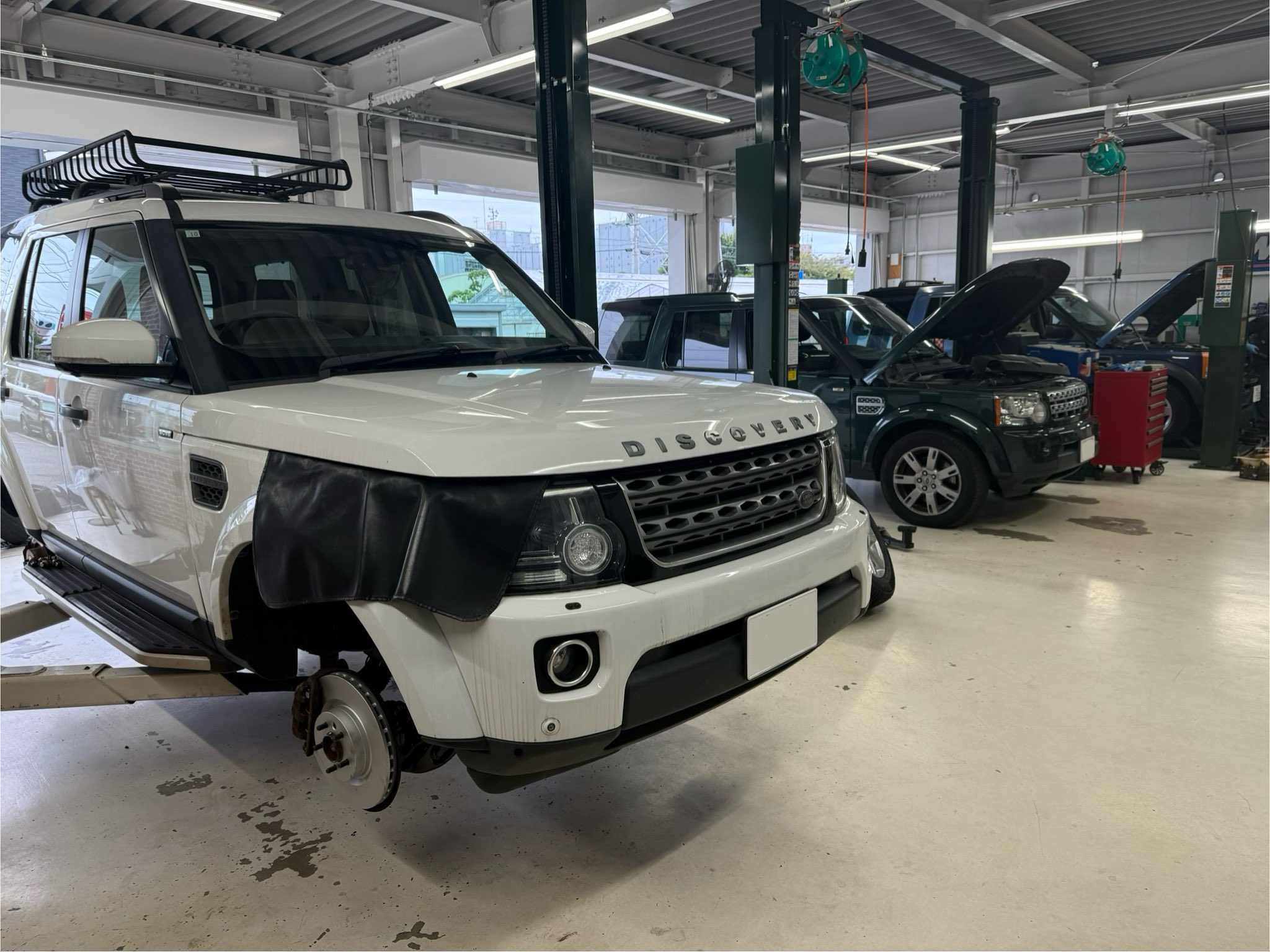 レイブリック三郷店の整備工場は3台の作業ベイがありますが、この日は3台ともディスカバリーシリーズが作業にかかっていました。