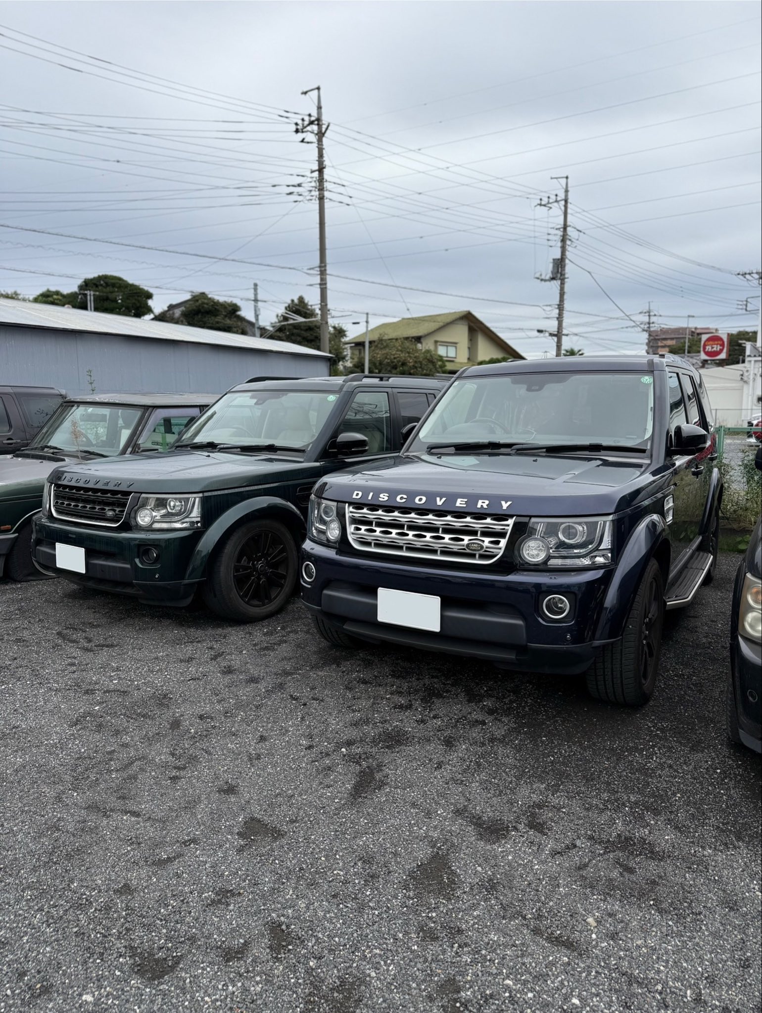 ランドローバーのメンテナンス整備作業で保管中の2台のディスカバリー。