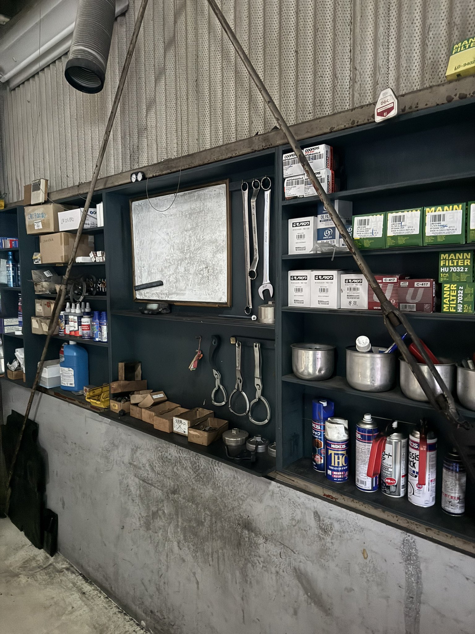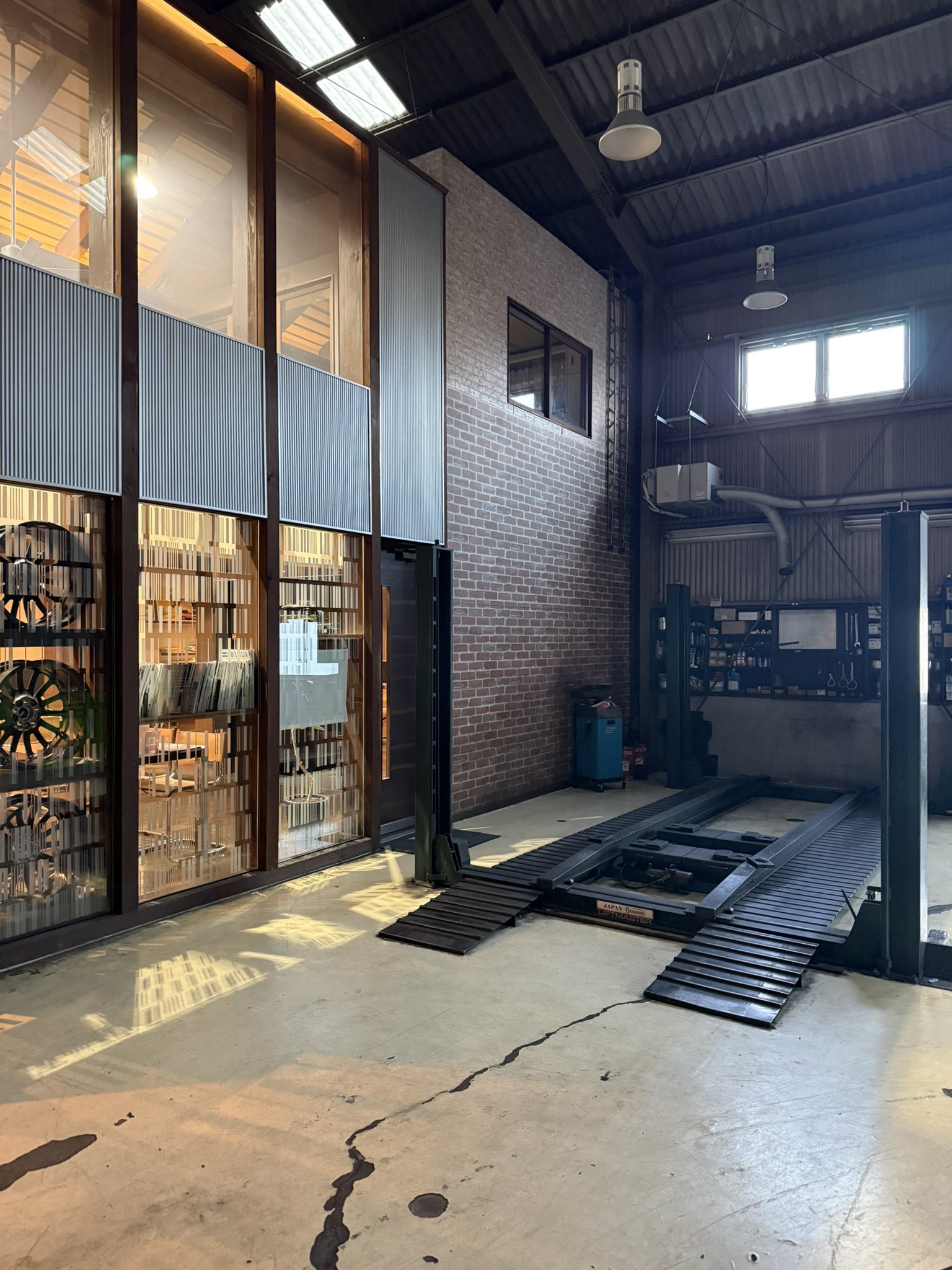 珍しくリフトにランドローバーが置かれていないなか、 工場内に薄っすらと漂う自動車用グリスの匂い。